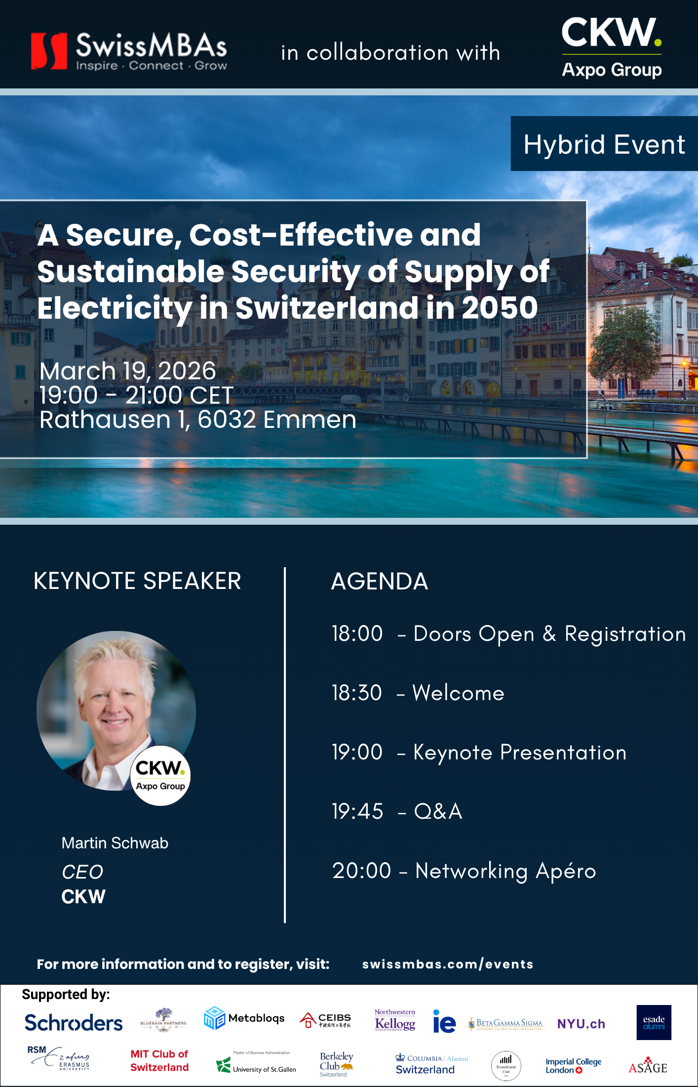 "By attending this event, you consent to being photographed or recorded for promotional and documentation purposes. If you do not wish to appear in our media, please notify us in advance or at the event. For questions or to withdraw consent, contact info@swissmbas.com. For more details about how we treat your data, please see our data protection policy (here https://swissmbas.com/page/privacy-policy)."