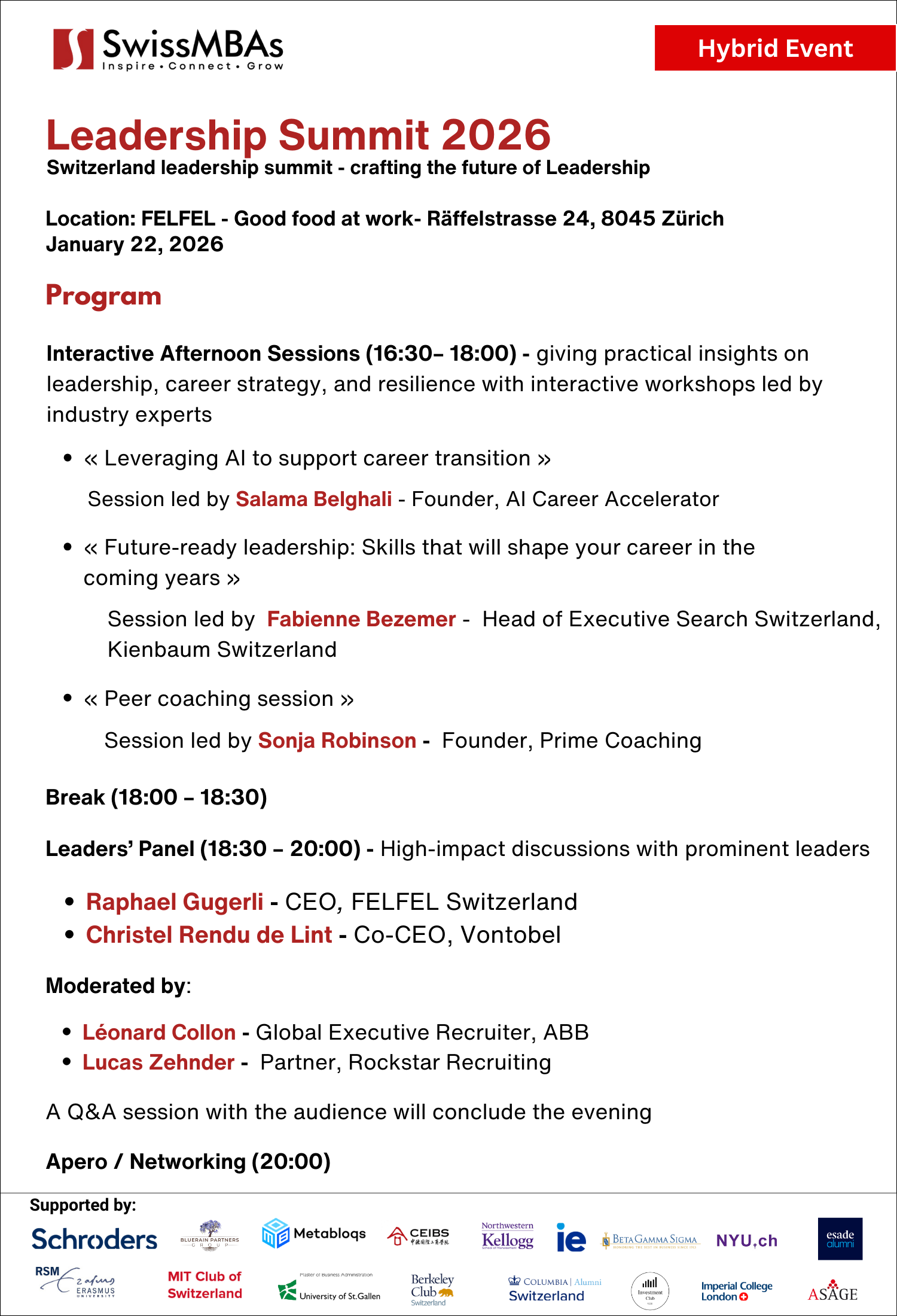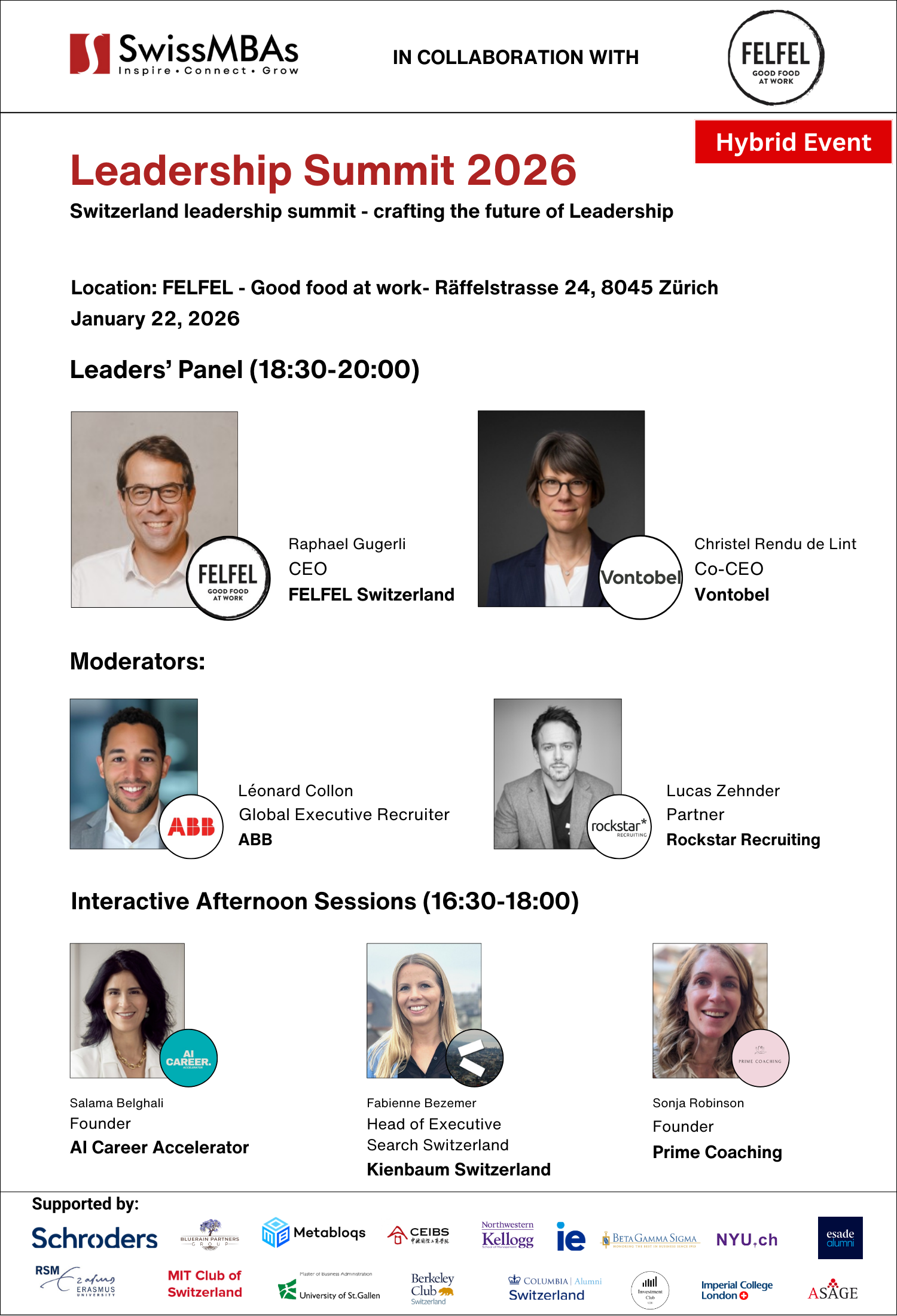 "By attending this event, you consent to being photographed or recorded for promotional and documentation purposes. If you do not wish to appear in our media, please notify us in advance or at the event. For questions or to withdraw consent, contact info@swissmbas.com. For more details about how we treat your data, please see our data protection policy (here https://swissmbas.com/page/privacy-policy)."