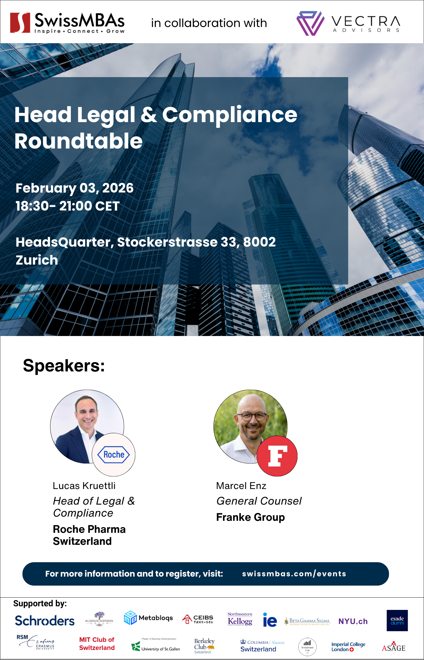 "By attending this event, you consent to being photographed or recorded for promotional and documentation purposes. If you do not wish to appear in our media, please notify us in advance or at the event. For questions or to withdraw consent, contact info@swissmbas.com. For more details about how we treat your data, please see our data protection policy (here https://swissmbas.com/page/privacy-policy)."