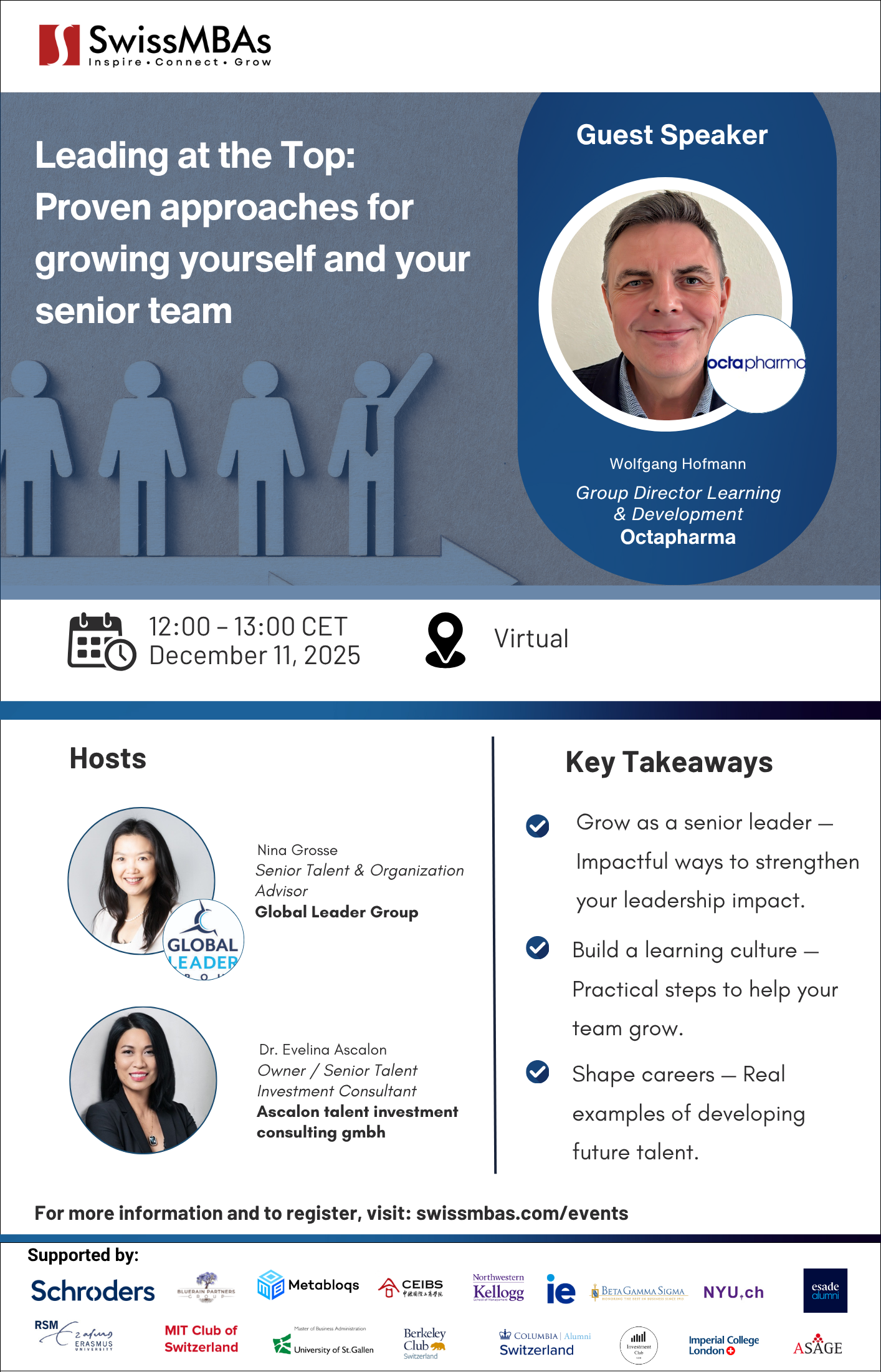 "By attending this event, you consent to being photographed or recorded for promotional and documentation purposes. If you do not wish to appear in our media, please notify us in advance or at the event. For questions or to withdraw consent, contact info@swissmbas.com. For more details about how we treat your data, please see our data protection policy (here https://swissmbas.com/page/privacy-policy)."