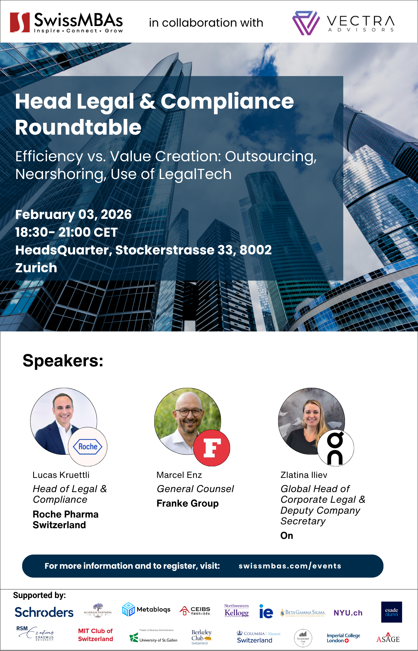 "By attending this event, you consent to being photographed or recorded for promotional and documentation purposes. If you do not wish to appear in our media, please notify us in advance or at the event. For questions or to withdraw consent, contact info@swissmbas.com. For more details about how we treat your data, please see our data protection policy (here https://swissmbas.com/page/privacy-policy)."